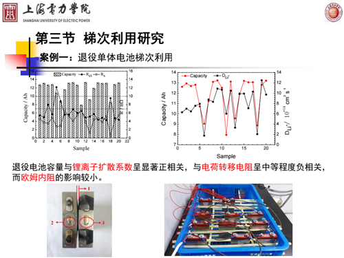 廖強(qiáng)強(qiáng)教授首先介紹了一個(gè)退役單體電池梯次利用的案例,他們發(fā)現(xiàn)電池容量與鋰離子擴(kuò)散系數(shù)呈顯著正相關(guān),與電荷轉(zhuǎn)移電阻呈中等程度負(fù)相關(guān),而歐姆內(nèi)阻的影響較小。