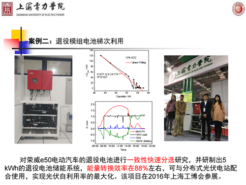 其次介紹了退役模組電池梯次利用案例,對(duì)榮威e50電動(dòng)汽車(chē)的退役電池進(jìn)行一致性快速分選研究,并研制出5kWh的退役電池儲(chǔ)能系統(tǒng),能量轉(zhuǎn)換效率在88%左右,可與分布式光伏電站配合使用,實(shí)現(xiàn)光伏自利用率的最大化。該項(xiàng)目在2016年上海工博會(huì)參展。