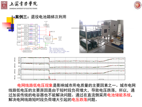 廖強(qiáng)強(qiáng)教授還在演講中介紹了退役電池箱梯次利用,指出電網(wǎng)線(xiàn)路低電壓現(xiàn)象是影響城市用電質(zhì)量的主要因素之一。城市電網(wǎng)線(xiàn)路低電壓的主要原因是由于短時(shí)段負(fù)荷增大,導(dǎo)致電壓跌落,所以,通過(guò)加裝傳統(tǒng)的電容器也不能解決問(wèn)題。通過(guò)在直流側(cè)采用電池儲(chǔ)能系統(tǒng),解決電網(wǎng)線(xiàn)路短時(shí)段負(fù)荷增大引起的電壓跌落問(wèn)題。