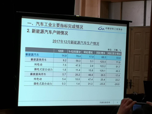 2018年1月11日,中國汽車工業(yè)協(xié)會召開2017年度12月份汽車產(chǎn)銷數(shù)據(jù)發(fā)布會。在新能源汽車部分,12月份產(chǎn)銷量分別為14 9萬輛和16 3萬輛 ,同
