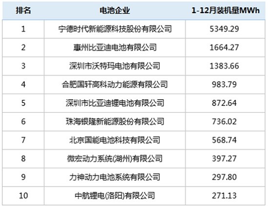 2017純電動客車動力電池裝機量TOP10 CATL/惠州比亞迪/沃特瑪占比超50%