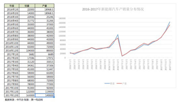產(chǎn)銷均接近80萬輛,這是我國(guó)2017年新能源汽車整體成績(jī)。在2016年底沖量之后,受市場(chǎng)淡季影響,2017年1月產(chǎn)量不足7000輛。隨后不斷波動(dòng)增長(zhǎng)