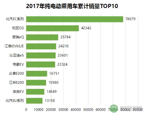根據乘聯會數據,2017年累計銷量過萬的純電動乘用車有17款,其中北汽EC系列累計銷量達到了78079臺,占比17.40%,奪得了第一。