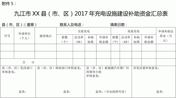 4. 九江市XX縣(市、區(qū))XXX年充電樁建設(shè)補(bǔ)助資金申請(qǐng)表;