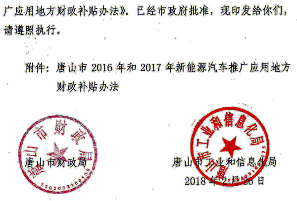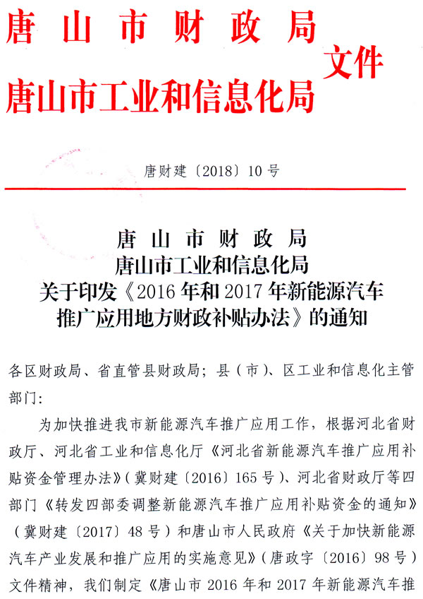 唐山市財政局關于印發(fā)《2016年和2017年新能源汽車推廣應用地方財政補貼辦法》的通知