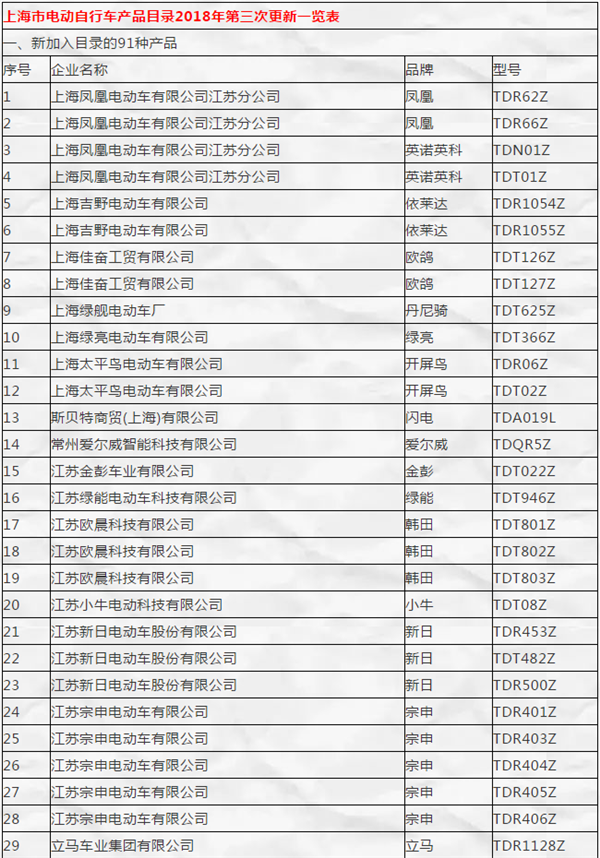 近期,上海市經(jīng)濟和信息化委員會下達了關(guān)于2018年第三次更新《上海電動自行車產(chǎn)品目錄》的通知,該目錄又上海市質(zhì)量技監(jiān)局、工商局、公安局、環(huán)保局及行業(yè)協(xié)會共同編制,新增了91個車型,并降某品牌車型從目錄中刪除!