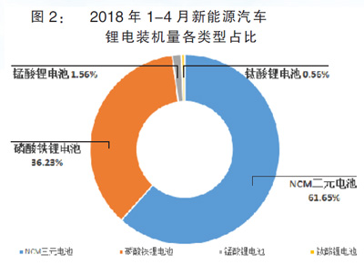 數(shù)據(jù)顯示,2018年1-4月新能源汽車鋰電裝機量8.23GWh,同比增長212.91%。從各類型鋰電看,NCM三元電池裝機以5.07GWh占比61.65%,排在第一位。磷酸鐵鋰電池以2.98GWh占比36.23%,排在第二位,市場份額已經(jīng)萎縮至不到四成;錳酸鋰電池以128.76MWh占比1.56%,排在第三位;鈦酸鋰電池以45.80MWh占比0.56%,排在最后(見圖2)。