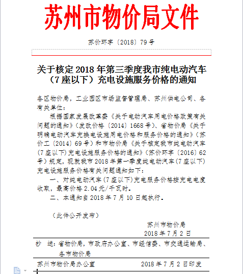 根據(jù)國(guó)家發(fā)展改革委《關(guān)于電動(dòng)汽車(chē)用電價(jià)格政策有關(guān)問(wèn)題的通知》(發(fā)改價(jià)格〔2014〕1668號(hào))、江蘇省物價(jià)局《關(guān)于明確電動(dòng)汽車(chē)充換電設(shè)施用電價(jià)格和服務(wù)價(jià)格的通知》(蘇價(jià)工〔2014〕69號(hào))和蘇州市物價(jià)局《關(guān)于核定我市純電動(dòng)客車(chē)(12m)充電設(shè)施服務(wù)價(jià)格的通知》(蘇價(jià)工字〔2015〕31號(hào))、《關(guān)于核定我市純電動(dòng)汽車(chē)(7座以下)充電設(shè)施服務(wù)價(jià)格的通知》(蘇價(jià)環(huán)字〔2016〕62號(hào))規(guī)定,現(xiàn)就蘇州市純電動(dòng)客車(chē)(12m)充電設(shè)施服務(wù)價(jià)格和蘇州市純電動(dòng)汽車(chē)(7座以下)充電設(shè)施服務(wù)價(jià)格有關(guān)問(wèn)題通知如下: