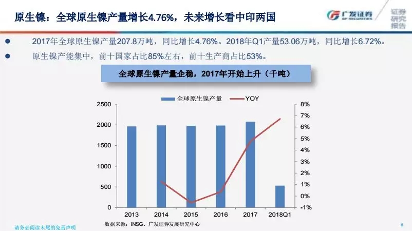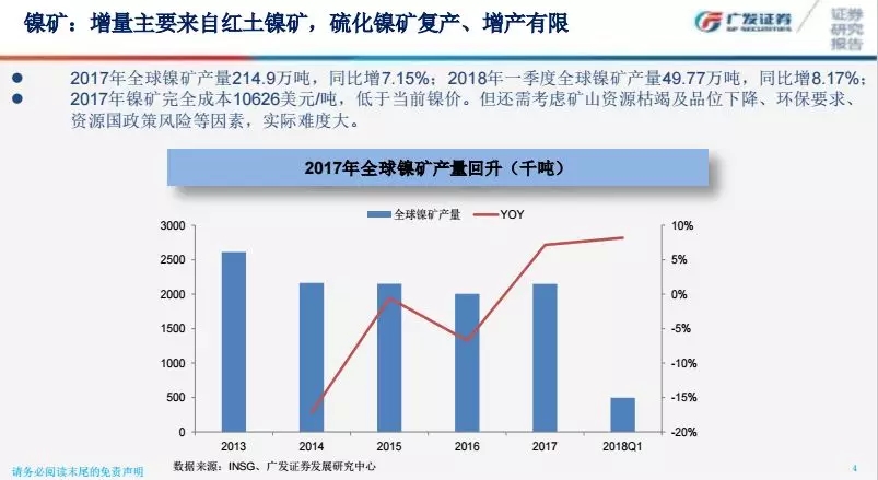 全球鎳礦產(chǎn)量出現(xiàn)一定程度提升,和需求的上揚是基本比較匹配的。鎳礦主要供應(yīng)來自菲律賓和印尼,印尼有些產(chǎn)業(yè)政策,把在中國的生產(chǎn)線把搬到了印尼,這也是很多企業(yè)在印尼形成了一些產(chǎn)能原因。印尼鎳礦出口有一定配額,通常來說在那邊建立生產(chǎn)線的企業(yè)會給予一定程度的配額,截至5月份配額還是有一定的數(shù)量。菲律賓最大的問題是環(huán)保的問題,我們看到杜特爾特(菲律賓總統(tǒng))很多次強調(diào)環(huán)保的問題,可能造成菲律賓鎳礦產(chǎn)量的下行。