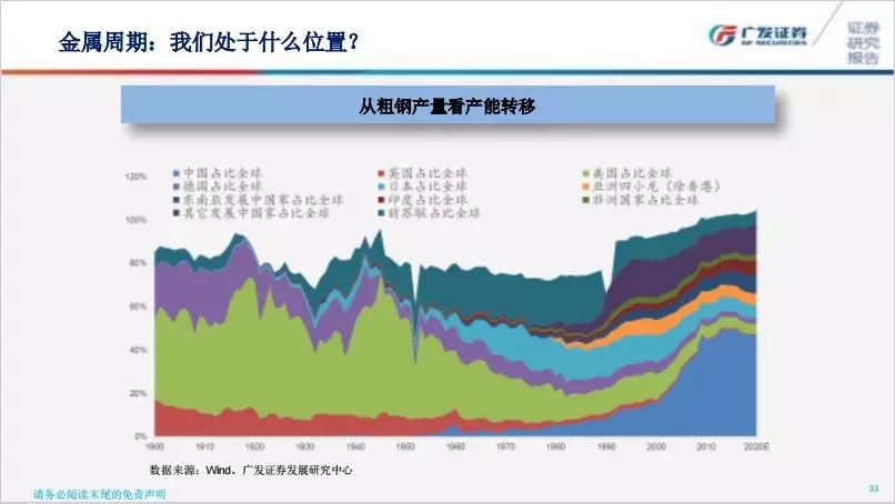 這里面的圖片我們用粗鋼產(chǎn)量占比來表述整個產(chǎn)能轉(zhuǎn)移周期,1900年到現(xiàn)在,綠色的這部分本來是美國,這都是占比。綠色這部分是美國,美國長期來講一開始粗放產(chǎn)量占全球比重非常高,后來轉(zhuǎn)到德國、蘇聯(lián)還有日本以及亞洲四小龍,藍色部分是中國,現(xiàn)在產(chǎn)能占比非常高,過了基礎(chǔ)潮之后我們在全球占比就會出現(xiàn)下降。我們大膽預(yù)測未來十幾年時間,這種產(chǎn)業(yè)趨勢是在東南亞甚至不排除非洲,這塊形成有色金屬形成大周期的需求所在。