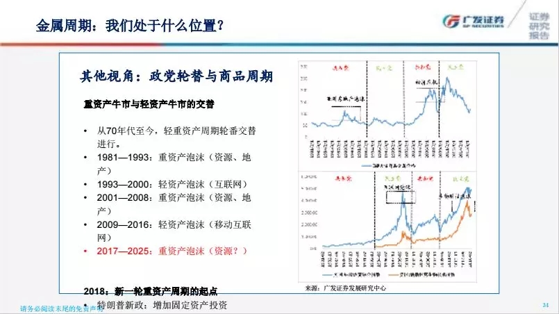 我們再從另外一個角度思考金屬周期的問題。這個圖是我們之前寫的一個報告,非常有意思的觀點,提出來大家探討。每次共和黨執(zhí)政會遇到商品的大牛市,民主黨執(zhí)政會遇到一次科技的泡沫。1981-1993(里根+老布什)年有一次海灣戰(zhàn)爭以及原油、商品大牛市,1993年-2000年(克林頓執(zhí)政)是互聯(lián)網(wǎng)泡沫,2001-2008年小布什執(zhí)政又是一次重資產(chǎn)(原油、商品)泡沫,2009-2016年是奧巴馬在任時又產(chǎn)生輕資產(chǎn)泡沫。我們這篇報告寫在特朗普上臺之前,我們認(rèn)為特朗普若贏得大選,商品可能迎來新的景氣周期。站在目前的時間點我們想一下,銅價什么時候開始上漲的?原油、國際航運指數(shù)呢?是不是在特朗普上臺前后那幾天開始上漲,而且聯(lián)動上行?