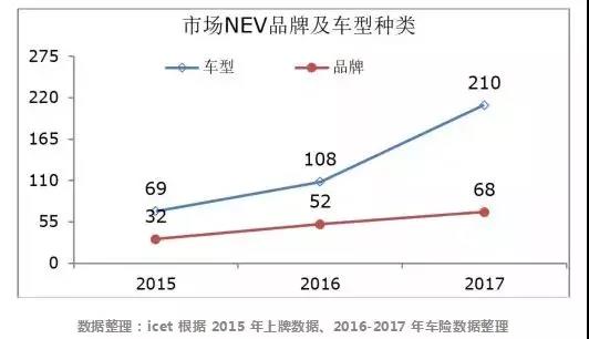 2017年,中國(guó)新能源乘用車銷量為57.9萬(wàn),其中純電動(dòng)汽車有46.8萬(wàn)輛,插電式混合動(dòng)力車為11.1萬(wàn)輛。2015-2017年,中國(guó)新能源乘用車品牌種類逐年增加,由32個(gè)增至68個(gè),對(duì)應(yīng)車型數(shù)量由69款增至210款??傮w呈多樣化趨勢(shì)發(fā)展,整體走勢(shì)良好。