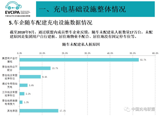 未隨車配建充電設施原因較為集中。截至2018年9月,通過聯(lián)盟內(nèi)成員整車企業(yè)采樣約55.3萬輛車的車樁相隨信息,其中未隨車配建充電設施17萬臺,整體未配建率30.7%。集團用戶自行建樁、居住地物業(yè)不配合、居住地沒有固定停車位這三個因素是未隨車配建充電設施的主要原因,占比達75.8%,其余原因占比為24.2%。