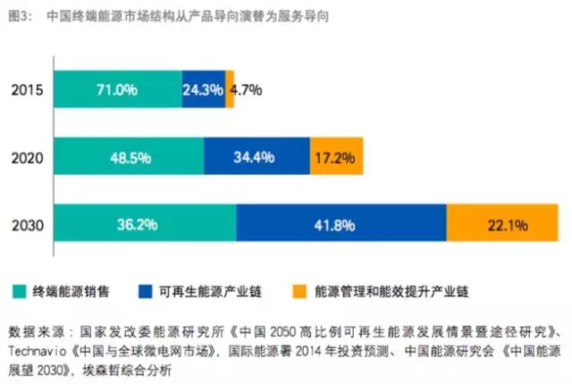 埃森哲預(yù)測(cè),2030 年中國可再生能源產(chǎn)業(yè)鏈、能源管理和能效提升產(chǎn)業(yè)鏈的增加值將達(dá)到12.3萬億元 。(在終端能源市場(chǎng)整體規(guī)模中占比 63.8%), 遠(yuǎn)超傳統(tǒng)的能源銷售市場(chǎng)規(guī)模。