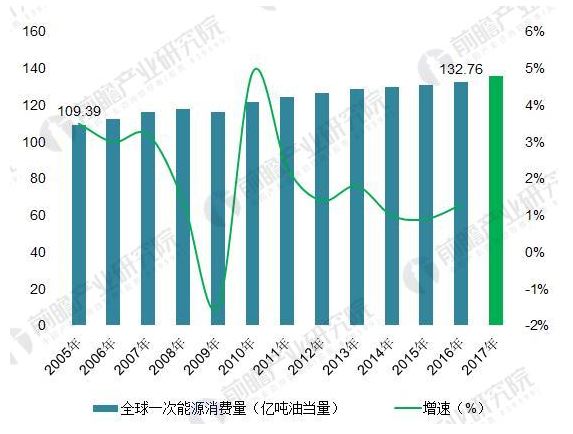 圖表4:2005-2017年全球一次能源消費(fèi)總量及增速(單位:億噸油當(dāng)量,%)
