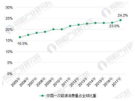 圖表6:2005-2017年中國(guó)大陸一次能源消費(fèi)總量占全球比重變化(單位:%)