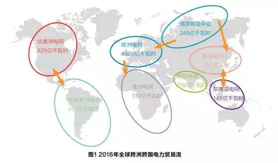 全球化石能源貿(mào)易已形成多個(gè)發(fā)達(dá)的大宗商品市場(chǎng),相對(duì)而言,電力交易受電網(wǎng)基礎(chǔ)設(shè)施和電力市場(chǎng)發(fā)展程度制約,仍處于發(fā)展起步階段,規(guī)模較小。2016年,全球跨國(guó)交易電量達(dá)到7650億千瓦時(shí),其中歐洲電網(wǎng)占4800億千瓦時(shí),北美洲電網(wǎng)占929億千瓦時(shí),是跨國(guó)電力貿(mào)易規(guī)模最大的地區(qū)。電力貿(mào)易涉及能源安全,因此,政治層面的可行性是電網(wǎng)跨境互聯(lián)和貿(mào)易的先決條件。目前跨國(guó)電力貿(mào)易主要集中在地緣政治局勢(shì)良好的歐洲、北美地區(qū),一定程度上也反映了地區(qū)和諧共享理念的發(fā)展程度。