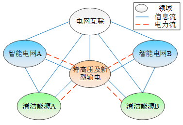 智能電網(wǎng)是GEI的重要支撐,是清潔能源利用和消納的主體,直接保障區(qū)域電網(wǎng)的互聯(lián)互通、安全穩(wěn)定、綠色高效運(yùn)行。主要包括智能輸變電、智能配電域、智能用電、電力物聯(lián)網(wǎng)4個子域。前3個子域之間建立電氣與通信連接,電力物聯(lián)網(wǎng)通過信息流將3個子域關(guān)聯(lián)起來,通過多領(lǐng)域協(xié)作實現(xiàn)智能輸變電與其他國家智能電網(wǎng)和清潔能源基地互聯(lián)的目標(biāo)。
