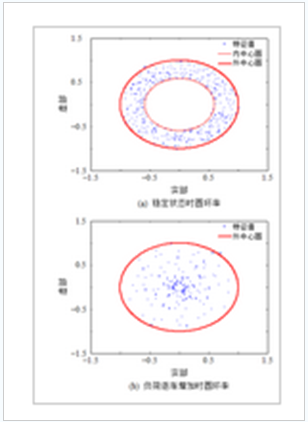 對(duì)數(shù)據(jù)處理后分析結(jié)果可視化如圖2所示,當(dāng)系統(tǒng)穩(wěn)定運(yùn)行時(shí),所有特征值落在圓環(huán)之間,如圖2(a)。在此基礎(chǔ)上逐漸增加負(fù)荷,可以看到特征值分布逐漸靠近圓心,如圖2(b)。當(dāng)負(fù)荷增加到一定程度,系統(tǒng)接近崩潰時(shí),特征值的分布更接近圓心,分布范圍更廣。