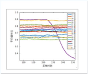 對(duì)應(yīng)一個(gè)負(fù)荷節(jié)點(diǎn)有功功率與發(fā)電機(jī)、負(fù)荷節(jié)點(diǎn)的電壓構(gòu)成的隨機(jī)矩陣。在第200個(gè)采樣時(shí)刻之前17條曲線平均譜半徑值均呈現(xiàn)出平穩(wěn)的趨勢(shì),而后,其中16條平均譜半徑值相對(duì)平穩(wěn),1條曲線的平均譜半徑呈現(xiàn)下降趨勢(shì)。曲線和隨機(jī)矩陣一一對(duì)應(yīng),隨機(jī)矩陣和電網(wǎng)負(fù)荷節(jié)點(diǎn)一一對(duì)應(yīng),可以看出第18節(jié)點(diǎn)處負(fù)荷功率發(fā)生了變化。