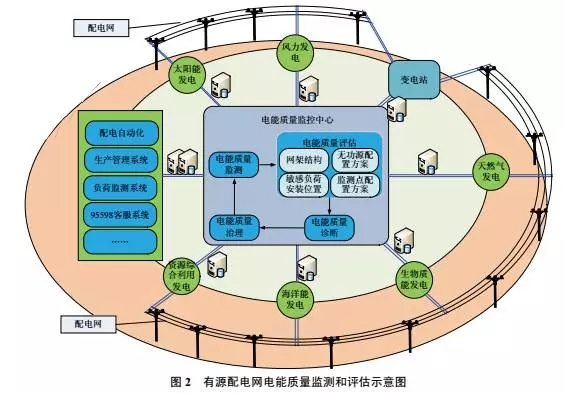 隨著分布式電源不斷地接入配電網(wǎng),逐步形成了小、中、大規(guī)模的有源配電網(wǎng)。伴隨著分布式電源的功率波動(dòng),配電網(wǎng)中的電能質(zhì)量經(jīng)受著較大的沖擊。通過(guò)收集配電網(wǎng)中的運(yùn)行數(shù)據(jù)、負(fù)荷數(shù)據(jù)、分布式電源運(yùn)行等數(shù)據(jù),能夠開(kāi)展配電網(wǎng)中的電能質(zhì)量分析和評(píng)估研究,從而得出精細(xì)化的配電網(wǎng)網(wǎng)架和無(wú)功源的調(diào)節(jié)方案等。有源配電網(wǎng)電能質(zhì)量監(jiān)測(cè)和評(píng)估示意圖如圖2所示。