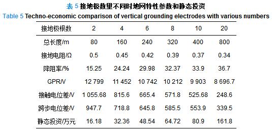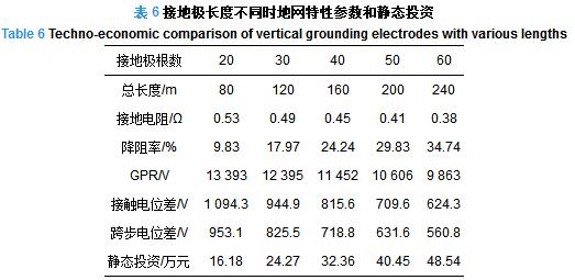 為了使降阻效果較明顯,在接地網(wǎng)初步設(shè)計方案的基礎(chǔ)上增加4根不同長度的深井接地極,表6是深井接地極長度不同時的技術(shù)經(jīng)濟比較。由表6可知,接地極長度越長,降阻和降壓效果越好。從表5和表6可以看出,深井接地極總長度相同的前提下,當總長度超過一定數(shù)值(這里為160 m)時,增加接地極長度比增加接地極數(shù)量降阻效果更好。