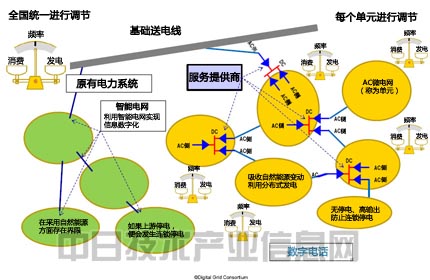 阿部先生提出了“數(shù)字電網(wǎng)”(Digital Grid)概念,其工作原理是,構(gòu)建多個包括發(fā)電設(shè)備、用電方及存儲設(shè)備在內(nèi)的單元,利用帶IP地址的數(shù)字電網(wǎng)路由器(DGR),將這些單元靈活地連接在一起。DGR可使模擬電力實(shí)現(xiàn)數(shù)字化,切斷發(fā)電設(shè)備與用電方的電力聯(lián)系,從而使發(fā)電設(shè)備和用電設(shè)備從各種電力制約中解放出來。并且通過統(tǒng)一數(shù)字化,使電力系統(tǒng)與控制信息系統(tǒng)實(shí)現(xiàn)虛擬一體化,也與結(jié)算系統(tǒng)實(shí)現(xiàn)一體化。