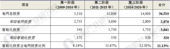 根據(jù)國網(wǎng)公司2010年3月發(fā)布的《國家電網(wǎng)智能化規(guī)劃總報告(修訂稿)》,2009年至2020年國家電網(wǎng)計劃總投資3.45萬億元,智能化投資3,841億元,占電網(wǎng)總投資的11.13%。《國家電網(wǎng)智能化規(guī)劃總報告(修訂稿)》將“堅強智能電網(wǎng)”的建設計劃劃分為三個階段,其中2016年至2020年為引領提升階段,計劃總投資1.4萬億元,該階段重點是基本建成堅強智能電網(wǎng),使電網(wǎng)的資源配置能力、安全水平、運行效率以及電網(wǎng)與電源、用戶之間的互動性顯著提高。