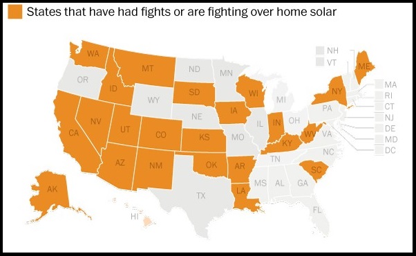 圖5:反對家用太陽能的美國各州(曾經(jīng)反對或現(xiàn)正抗拒家用太陽能的美國各州示意圖) (來源:The Washington Post)