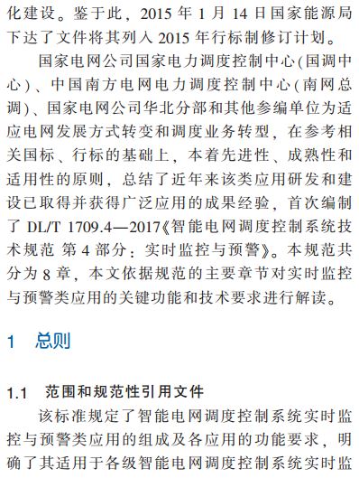 本文在對(duì)中國(guó)智能電網(wǎng)調(diào)度控制系統(tǒng)實(shí)時(shí)監(jiān)控與預(yù)警類應(yīng)用功能研究的基礎(chǔ)上,對(duì)今年來(lái)相關(guān)應(yīng)用建設(shè)和實(shí)用化成果進(jìn)行提煉總結(jié),形成電力行業(yè)標(biāo)準(zhǔn)DL/T 1709.4-2017《智能電網(wǎng)調(diào)度控制系統(tǒng)技術(shù)規(guī)范第4部分:實(shí)時(shí)監(jiān)控與預(yù)警》。分別從總體原則和接口要求、電網(wǎng)實(shí)時(shí)監(jiān)控與智能告警、電網(wǎng)自動(dòng)控制、電網(wǎng)運(yùn)行分析與決策、輔助監(jiān)測(cè)等方面對(duì)該規(guī)范進(jìn)行解讀,重點(diǎn)對(duì)每個(gè)應(yīng)用的功能要求和核心要點(diǎn)進(jìn)行解釋說(shuō)明,可進(jìn)一步提高調(diào)度自動(dòng)化人員對(duì)該類功能的正確使用,便于相關(guān)研究、設(shè)計(jì)、開(kāi)發(fā)、建設(shè)和運(yùn)行維護(hù)人員對(duì)該標(biāo)準(zhǔn)的理解。