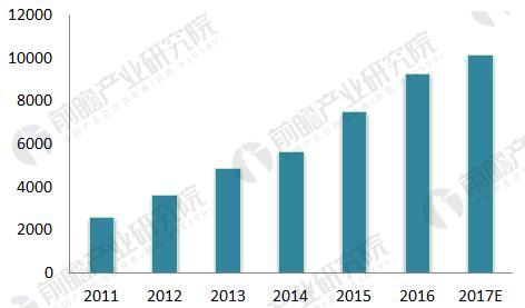 圖表2:2011-2017年中國傳感器市場規(guī)模情況(單位:億元)