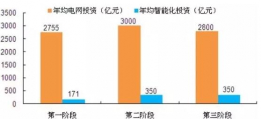 2009-2020年國(guó)家電網(wǎng)總投資3.45萬億元,其中智能化投資3841億元,占電網(wǎng)總投資的11.1%。第一階段2009-2010年的電網(wǎng)總投資為5510億元,智能化投資為341億元,占電網(wǎng)總投資的6.2%;第二階段電網(wǎng)總投資為15000億元,智能化投資為1750億元,占總投資的11.7%;第三階段電網(wǎng)總投資為14000億元,智能化投資為1750億元,占總投資的12.5%。