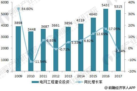 近年來,隨著中國經(jīng)濟的較快發(fā)展,東南沿海地區(qū)普遍出現(xiàn)了缺電的現(xiàn)象,中國電力發(fā)展長期存在的“重發(fā)輕送”問題逐漸暴露出來,其凸顯出的是中國電力行業(yè)發(fā)展中的一個薄弱環(huán)節(jié)——電網(wǎng)設施相對不足。2006年后,電網(wǎng)建設超過電源建設發(fā)展,成為電力建設的主要投資重點。電網(wǎng)投資比例持續(xù)上升,投資比例結構趨于合理,改善了近幾年中國電源投資規(guī)模過大、增速過快、比例過高的趨勢,電源與電網(wǎng)開始協(xié)調(diào)、科學發(fā)展。目前,特高壓、配電網(wǎng)及其新一輪農(nóng)網(wǎng)升級改造工程全面啟動,帶動電網(wǎng)投資大幅增長。2017年,電網(wǎng)工程建設完成投資5315億元,同比下降2.14%。