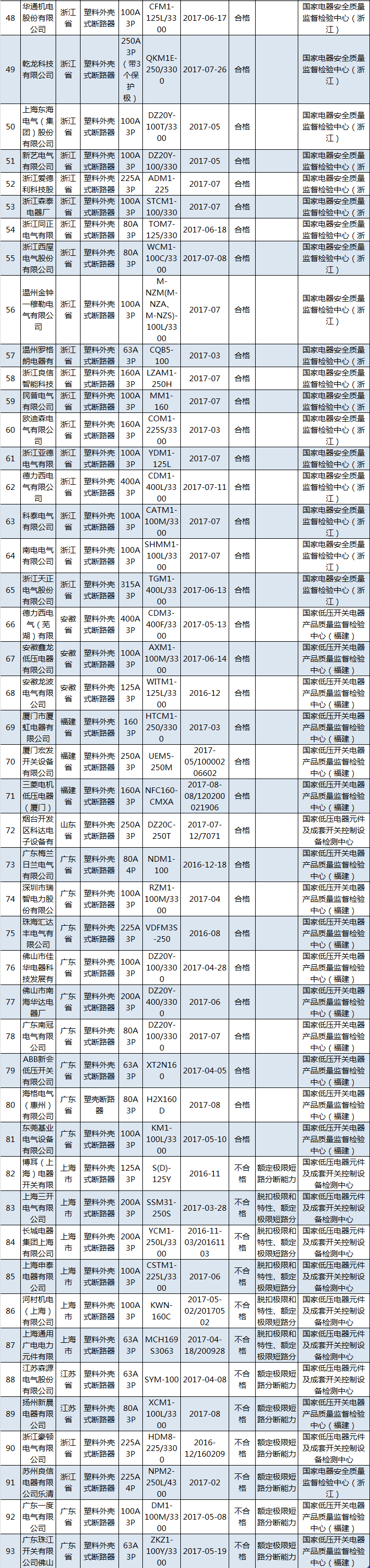 塑料外殼式斷路器產(chǎn)品質(zhì)量國(guó)家監(jiān)督抽查產(chǎn)品及其企業(yè)名單