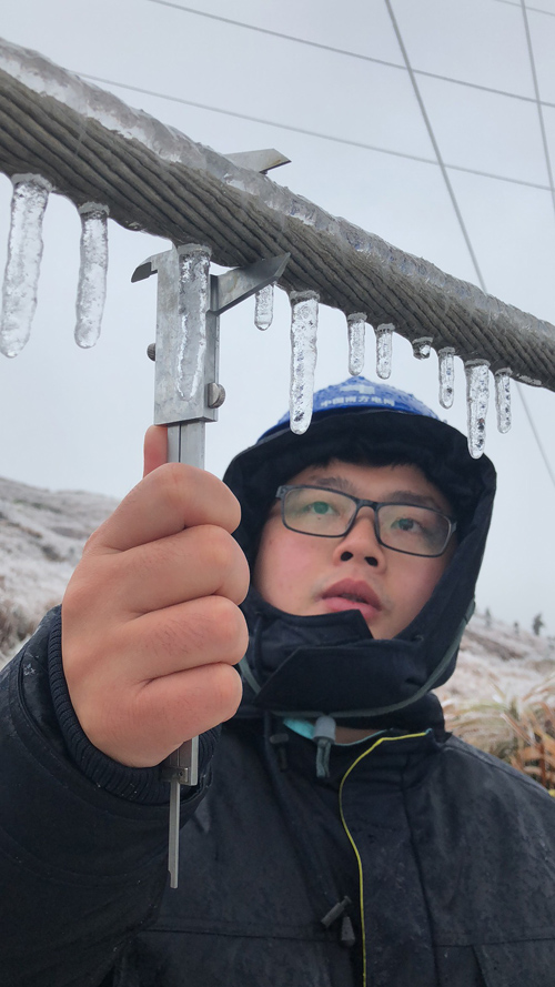 韶關(guān)供電員工測(cè)量線路覆冰。于芳芳 攝