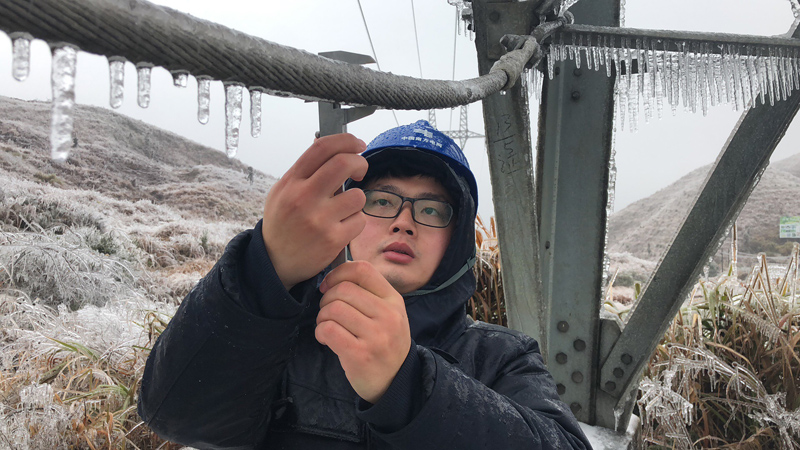韶關(guān)供電員工測(cè)量線路覆冰。于芳芳攝