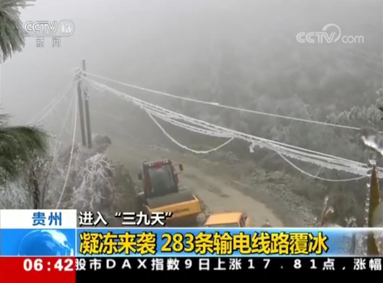 中央電視臺(tái)新聞?lì)l道《朝聞天下》欄目在2018年1月10日?qǐng)?bào)道:寒潮來襲,冰凍天氣使一些地方的輸電線路等設(shè)施受到了影響,受影響地區(qū)也都采取了多種措施來應(yīng)對(duì)。從2018年1月8日開始,廣東北部地區(qū)出現(xiàn)了供電線路覆冰情況。其中,兩條輸電線覆冰達(dá)到25毫米。此外,貴州地區(qū)有283條線路出現(xiàn)了覆冰情況。為保證安全用電,兩地電網(wǎng)公司均已啟動(dòng)直流融冰裝置對(duì)輸電線路實(shí)施融冰。