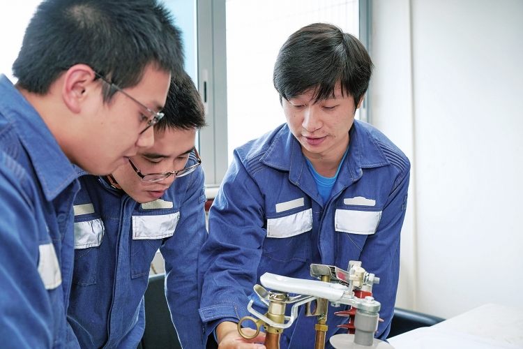 李正強(右一)與創(chuàng)客團隊正在研究和改良帶電合地刀裝置?!⒘?攝  短短幾年間,創(chuàng)客文化在廣東電網(wǎng)公司佛山供電局青年員工之中蔚然成風