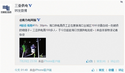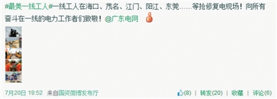 由于“威馬遜”破壞力極強,加之道路受阻等原因,給搶修復電工作帶來很大困難。當部分地區(qū)停電時間超過兩天,部分博友開始在微博上吐槽。在海南電網(wǎng)公司發(fā)布“海南電網(wǎng)員工莊華吉累倒在抗臺風搶修復電一線”,以及現(xiàn)場發(fā)布連夜搶修情況后,博友紛紛轉發(fā)、點贊。有博友評論說:“雖然我家現(xiàn)在還是沒電,但還是要贊一個!電網(wǎng)的同志們幸苦了?。?!請注意安全。”