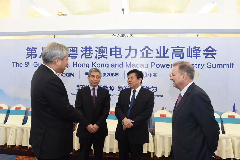 7月26日,第八屆粵港澳電力企業(yè)高峰會期間,南方電網(wǎng)公司黨組書記、董事長李慶奎,中國廣核集團有限公司董事長賀禹,香港中電控股有限公司首席執(zhí)行官藍凌志,澳門電力公司董事長傅建國進行親切友好交流。(孫維鋒 攝)