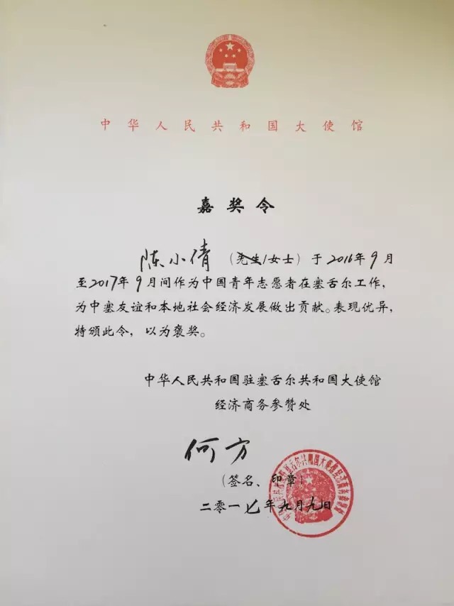 中華人民共和國駐塞舌爾共和國大使館為陳小倩頒發(fā)的嘉獎(jiǎng)令