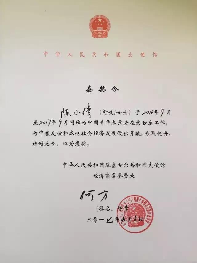 中華人民共和國駐塞舌爾共和國大使館為陳小倩頒發(fā)的嘉獎令