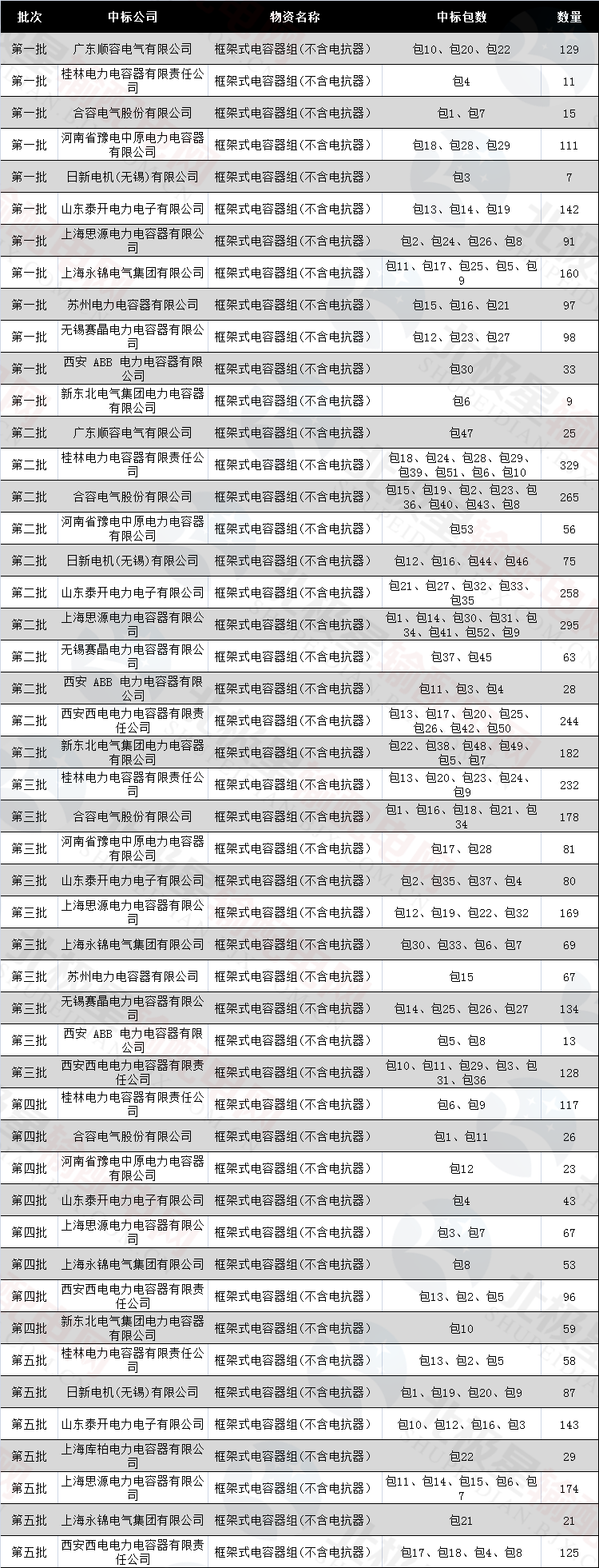 國家電網(wǎng)公司輸變電項(xiàng)目變電設(shè)備前五次框架式電容器組(不含電抗器)中標(biāo)情況