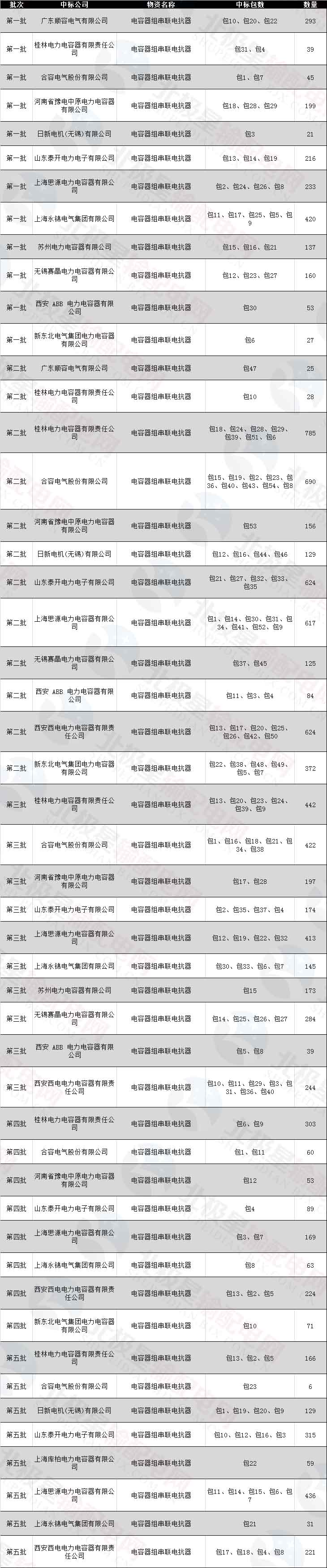 國家電網(wǎng)公司輸變電項(xiàng)目變電設(shè)備前五次電容器組串聯(lián)電抗器中標(biāo)情況