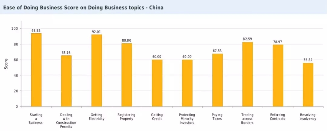 在去年和前年的報(bào)告中,中國的排名均為78名。今年,中國得分相比去年提升了8.64分,是營商環(huán)境改善最大的經(jīng)濟(jì)體之一。