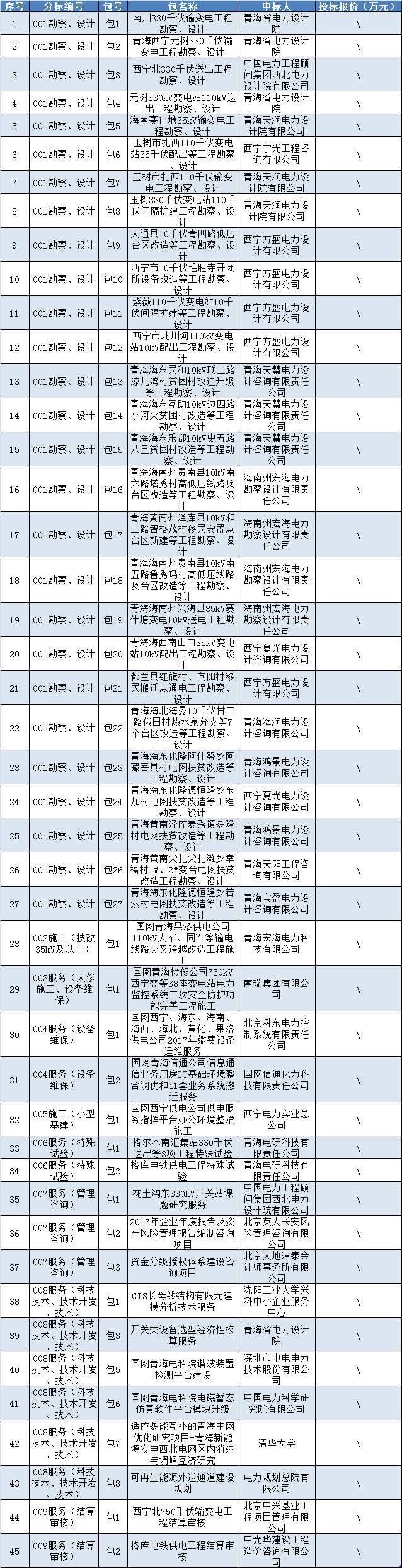 國網青海省電力公司2017年第六批服務類招標采購項目招標中標人名單
