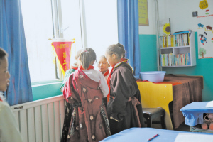 課間,青?,敹嗝褡寮乃拗浦袑W學生圍在溫暖的暖氣片旁說著知心話。白強 攝