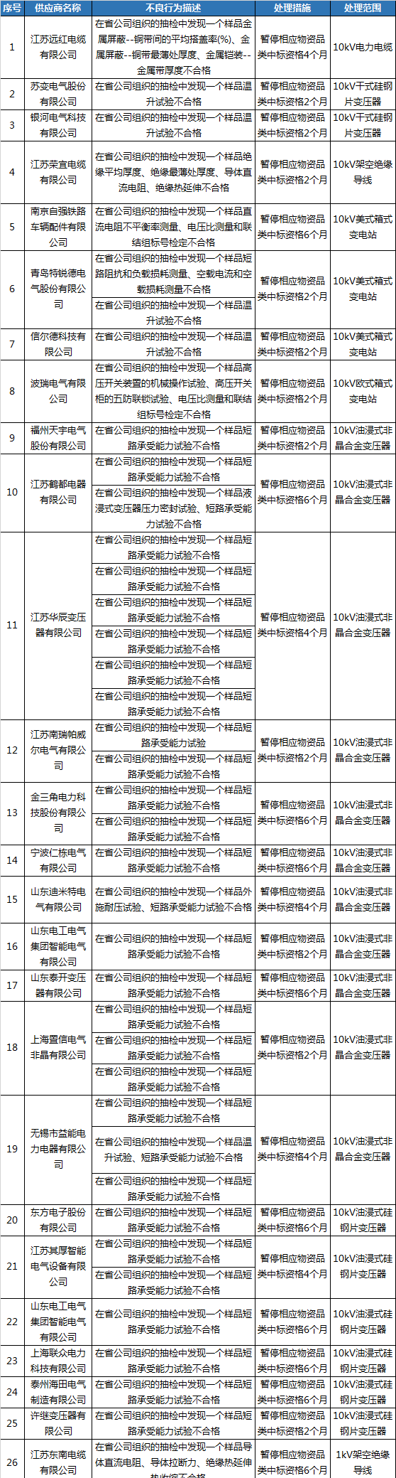 為促進(jìn)供應(yīng)商誠信履約,保證產(chǎn)品質(zhì)量,確保電網(wǎng)建設(shè)順利進(jìn)行及安全可靠供電,依據(jù)《國家電網(wǎng)公司供應(yīng)商不良行為處理管理細(xì)則》的有關(guān)規(guī)定,對出現(xiàn)產(chǎn)品質(zhì)量問題、履約不誠信等問題的供應(yīng)商進(jìn)行了處理。原標(biāo)題:江蘇