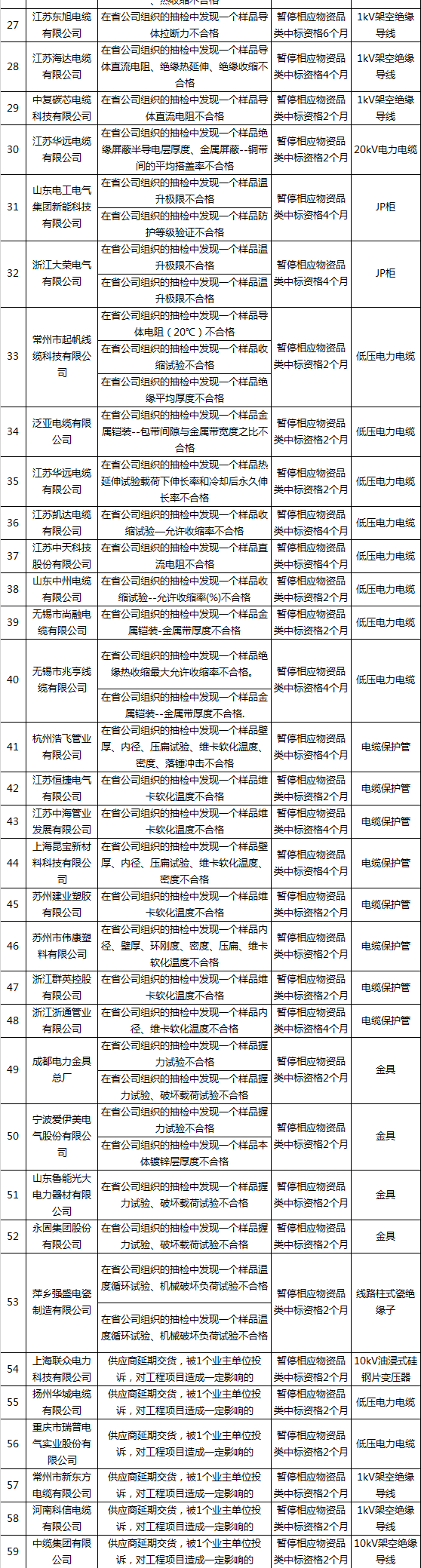 為促進(jìn)供應(yīng)商誠信履約,保證產(chǎn)品質(zhì)量,確保電網(wǎng)建設(shè)順利進(jìn)行及安全可靠供電,依據(jù)《國家電網(wǎng)公司供應(yīng)商不良行為處理管理細(xì)則》的有關(guān)規(guī)定,對出現(xiàn)產(chǎn)品質(zhì)量問題、履約不誠信等問題的供應(yīng)商進(jìn)行了處理。
