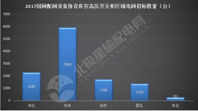 近年來,伴隨著電力發(fā)展步伐不斷加快,中國電網(wǎng)也得到迅速發(fā)展,電網(wǎng)系統(tǒng)運行電壓等級不斷提高,網(wǎng)絡(luò)規(guī)模也不斷擴大,國網(wǎng)經(jīng)營區(qū)域已經(jīng)形成了東北電網(wǎng)、華北電網(wǎng)、華中電網(wǎng)、華東電網(wǎng)、西北電網(wǎng)5個跨省的大型區(qū)域電網(wǎng)。2017年國網(wǎng)配網(wǎng)設(shè)備協(xié)議庫存柱上斷路器招標(biāo)5大區(qū)域電網(wǎng)均勻參與,從下圖可知,華中電網(wǎng)招標(biāo)數(shù)量遙遙領(lǐng)先,為5906臺,占比51.18%;華北、華東、西北電網(wǎng)招標(biāo)數(shù)量比較均勻,分布在1000—2000臺;東北電網(wǎng)最低,僅招標(biāo)251臺。